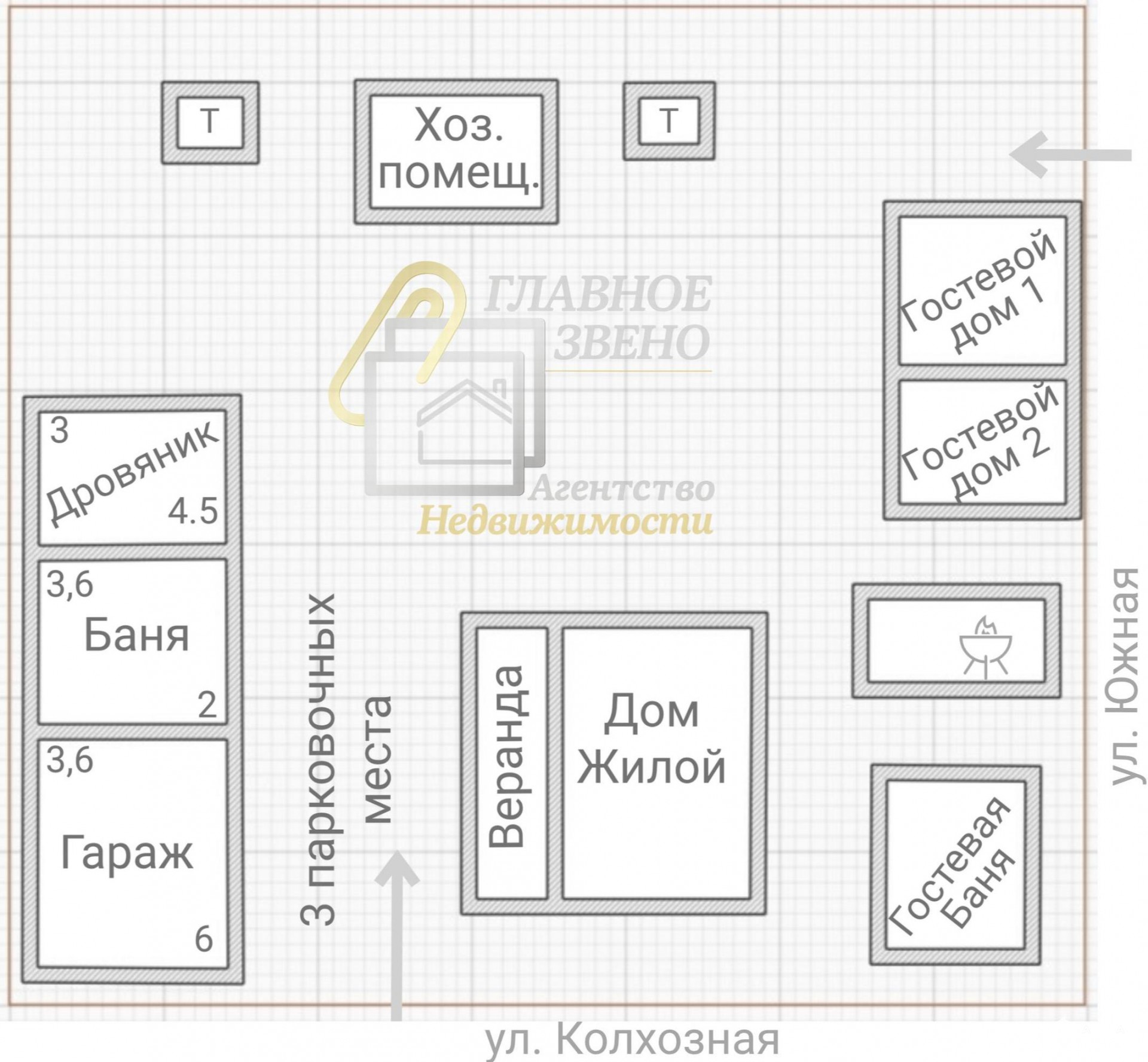 На участке площадью 1557 м² расположены две бани (личная и гостевая), два гостевых дома, два туалета, дровяник и большой гараж для автомобиля и хозяйственных нужд. Дополнительные три парковочных места обеспечат удобство для гостей или всей семьи.